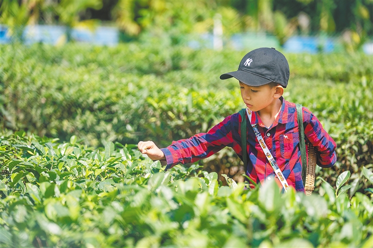 ①小游客在茶园小镇采摘茶叶。