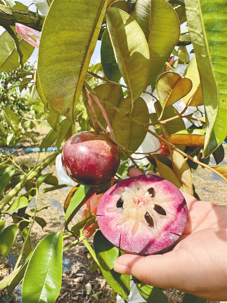 “这就是我们专门为春节档期引进培育的‘明星’水果——牛奶果。”基地主管曾宪纯摘下一枚紫红色的熟果,用水果刀轻轻切开,果冻般的果肉溢出奶白汁液,咬上一口,口感细腻软糯,清甜可口。“这片山头主要种植‘3Q’(紫皇星)和‘绿霸’两个品种,这种果树适应性强、喜光耐旱且抗风,单果最重能超过一斤。”
