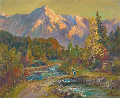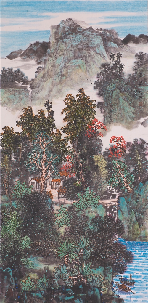 海南本土画家邓子芳的《春水润秀椰乡情》以全景式构图铺展出一幅充满生机的海南图景。远处山脉在云雾中若隐若现,近处椰树挺拔舒展,芭蕉、榕树等热带植物层层叠叠,浓淡相宜的墨色与青绿点染,将海南的温润与繁茂表现得淋漓尽致。山脚下,几间白墙红瓦的民居掩映于浓荫之中,潺潺溪流奔涌而下,一叶小舟泊于水面,勾勒出乡村生活的悠然诗意。