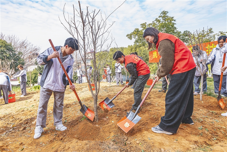 图为3月11日浙江湖州供电公司的“月圆公益”志愿服务队青年志愿者与湖州长兴职教中心学生,在校园内一同开展义务植树活动。新华社发