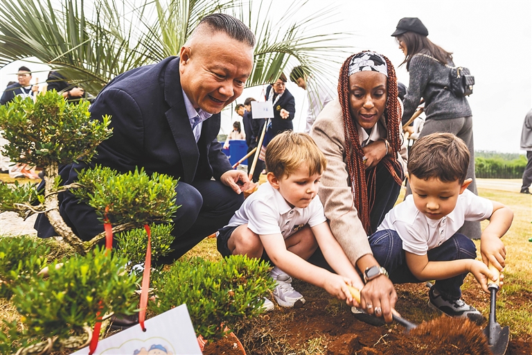 省对外交流中心、省公共外交协会、省欧美同学会、海口市外事办及英国盛彼德学校代表共同栽种布迪椰树、黄杨木等树种。