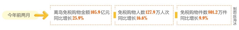 本报讯(海南日报全媒体记者曹马志 通讯员孙立业)海口海关日前发布统计数据,今年前两月,海关共监管离岛免税购物金额105.9亿元,免税购物人数127.9万人次,免税购物件数801.2万件,同比分别增长25.9%、16.6%、9.9%,“旅游+免税”消费模式再次展现了强劲动力。