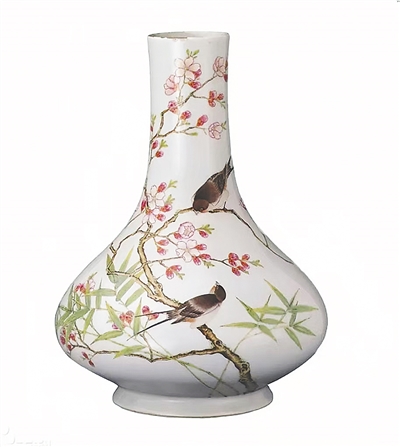“燕子归来杏子花,红桥低影绿池斜。”春天,柳绿花红,莺歌燕舞,处处洋溢着生机勃勃的气息。中国国家博物馆藏有一只清代粉彩杏林春燕纹瓷瓶,瓶壁上也描绘出了春日的美好景致。这只花瓶高32.7厘米,口径7.2厘米,足径14.1厘米。瓶直口,长颈,扁圆形腹,圈足。造型优雅。瓶身上,杏枝褪去了冬日的枯色,新抽的竹子也泛出了青绿。几簇杏花在枝头绽放,正在盛放的演绎出浓烈的玫粉色,含苞待放的则诠释清雅的淡粉色。这时,两只燕子轻盈地飞来,落在树枝上,刹那间,本就生香的春景“活”了起来。此器画法清丽隽雅,色彩鲜嫩,画意生动,动感强烈,营造出一种闲适恬淡的意境。