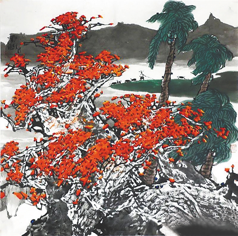 《红棉下的归牧》(国画)