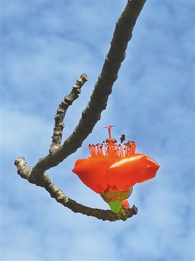 向往昌江的春天,从一朵木棉花出发。挡不住,抹不去,“满城都是木棉花”。昌江木棉已英姿逼人,这份早春献礼唤醒了昌江,鲜活了许多层次。久违的昌江又因木棉花的盛开,诞生了新年的美丽尘缘。初升日光映照,远处木棉越发耀眼,如同一束束形态变幻的火焰,“几树半天红似染”,灿烂得摄人心魄。它红得鲜艳而热烈,红得深沉且坚定。于此,你可以对挚爱的人表白:我必须是你近旁的一株木棉,作为树的形象和你永远站在一起。
