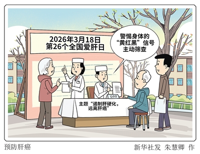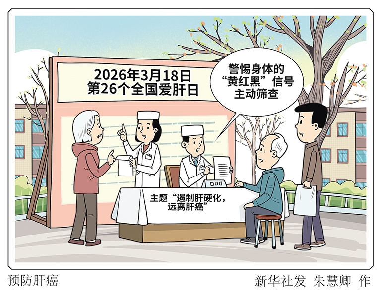 今年3月18日是第26个全国爱肝日。专家介绍,早期肝癌几乎无症状,但是,一旦进入肝功能失代偿的中期甚至晚期,身体往往会发出典型的“黄红黑”三色警报——黄:皮肤、眼白变黄,尿液颜色像浓茶,这是黄疸。红:出现“蜘蛛痣”,即胸前、颈部出现带红点的血丝;或出现“肝掌”,即手掌心泛白,大鱼际、小鱼际发红,与普通人的手掌皮肤均匀呈现淡红色有所不同。黑:大便颜色突然变黑,像柏油一样发亮,这是提示消化道出血。新华社发