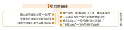 当天发布的7项案例具有“两强一高”的鲜明特点:首创性强,均为海南的原创性成果,对全国其他地区推进相关领域改革创新具有很好的借鉴示范意义;集成性强,体现了各市县各部门上下联动协同创新;认可度高,大部分得到了国家层面的充分认可。