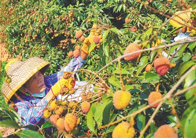 3月19日,乐东黎族自治县万冲镇“桂花香”荔枝果园里,工人忙着采摘荔枝。连日来,“桂花香”荔枝陆续进入成熟期,以“上市早、口感佳、品质精”的核心优势抢占鲜果市场先机,受北京、上海等地市场青睐,每斤销售价可达50元至60元。