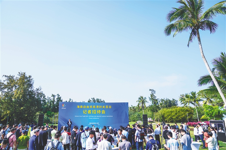 3月26日下午,在琼海博鳌东屿岛文化公园二号草坪区,一场别开生面的招待会——海南自由贸易港封关百日记者招待会,现场人头攒动。主持人用“更热”来描述现场氛围。