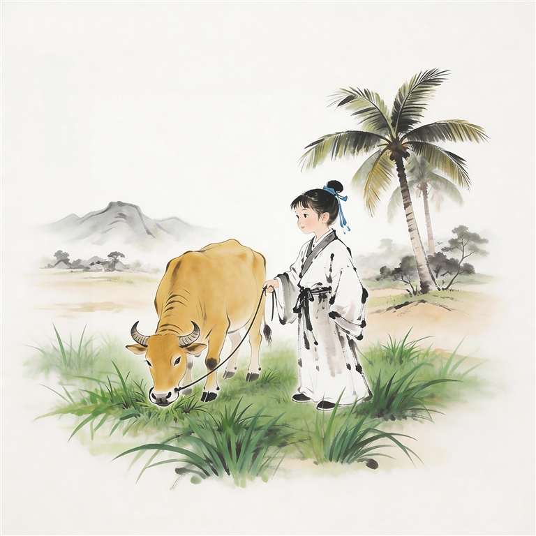 从福建迁至海南琼山,明代初期丘家人单势寡;祖父丘普、父亲丘传以医传家,微薄的收入难以维持一家人的日常开支,丘濬在学习之余,帮着家里放牛砍笋。“稻草捆秧母抱子”“镰刀割笋公携孙”便是他童年生活的真实写照。他在《书百牛图后》中所说的“我本农家子,儿时曾作牧”,与宋代周敦颐的诗《牧童》中“东风放牧出长坡,谁识阿童乐趣多”相比,多了一份艰辛和不易。