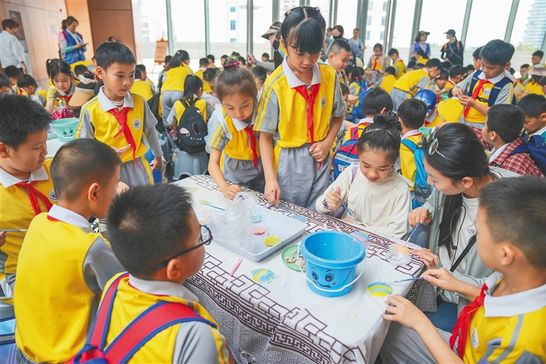 4月3日,海南省非遗展示中心春季首场研学活动举行。图为海口市第九小学的学生制作贝雕冰箱贴。下一步,该中心将持续推出特色研学活动,助力青少年走近非遗、热爱非遗,推动非遗传承。