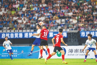 4月11日,“启航自贸港”第一届海南省城市足球联赛(以下简称“琼超”联赛)决赛在琼海市文化体育中心体育场开赛,经过一番鏖战,海口队最终以2:0击败琼中队,斩获首届“琼超”联赛冠军。图为两队球员在比赛中激烈拼抢。(相关报道见A04版)海南日报全媒体记者 李天平 摄