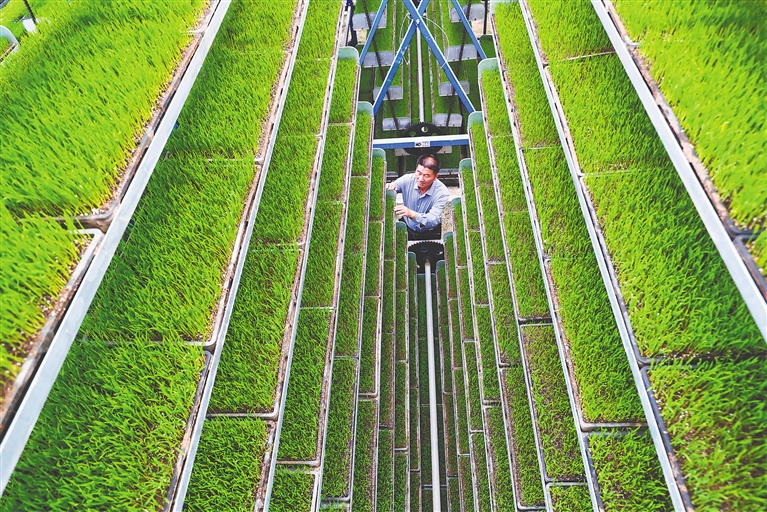 ① 4月6日,河南省信阳市光山县青龙河合作社全自动智能化育秧工厂,工作人员在管护水稻秧苗。