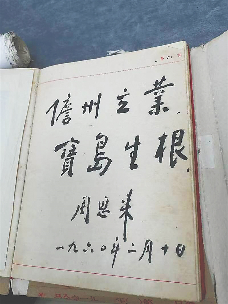王永昌到儋县县委后,向县委书记张文杰说明了情况。张文杰领着王永昌进入会议室。当时,周总理正坐在会议室的藤椅上休息。了解王永昌的来意后,总理示意王永昌留下本子,并对他说了几句鼓励的话,提到“你们各个办公室、实验室门口都贴上了春联,喜气洋洋,高高兴兴,很好!”王永昌小心地把题字簿放在会议桌上,然后高高兴兴地离开了。