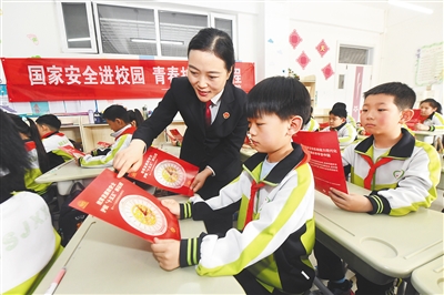 图为4月14日在河北省石家庄新乐市民生街小学,新乐市人民检察院工作人员在给学生讲解国家安全相关知识。新华社发