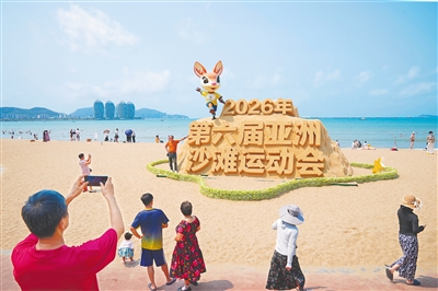 随着第六届亚洲沙滩运动会开幕临近,三亚全城装扮一新,处处洋溢热烈的赛事氛围,全民携手喜迎亚洲盛会。市区主干道亚沙主题道旗迎风舒展,公交、有轨电车上喷绘的吉祥物“亚亚”形象成为流动风景线。图为近日市民游客在该市海月广场亚沙特色沙滩景观打卡点游玩拍照。