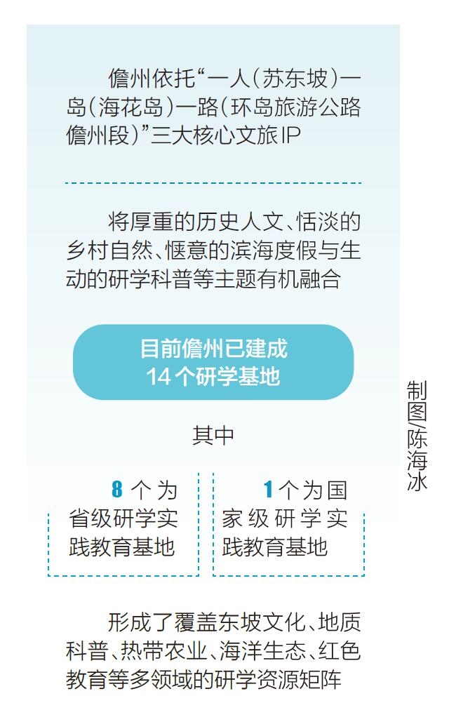 东坡文化是儋州亮丽的文化名片,也是儋州打造“研学儋洋”品牌的核心资源之一。儋州依托“一人(苏东坡)一岛(海花岛)一路(环岛旅游公路儋州段)”三大核心文旅IP,将厚重的历史人文、恬淡的乡村自然、惬意的滨海度假与生动的研学科普等主题有机融合。目前,儋州已建成14个研学基地,其中8个为省级研学实践教育基地,1个为国家级研学实践教育基地,形成了覆盖东坡文化、地质科普、热带农业、海洋生态、红色教育等多领域的研学资源矩阵。