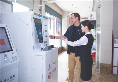 5 外籍来华客户在中行网点使用外币兑换机。