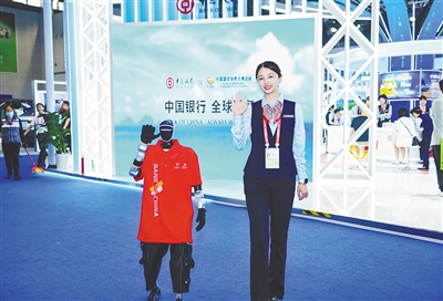 1 中行员工在全球服务展台与AI机器人迎宾。