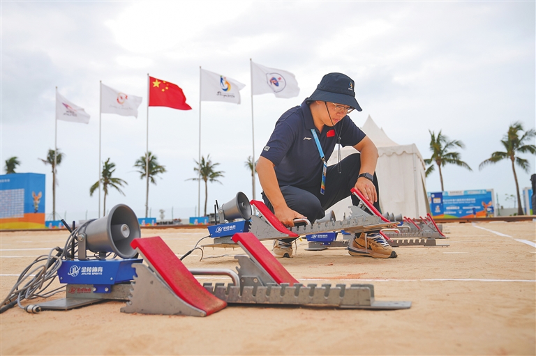 4月18日,第六届亚洲沙滩运动会沙滩田径赛场工作人员在摆放调试设备。据介绍,目前亚沙会筹备进入冲刺阶段,三亚河龙舟赛场、凤凰岛沙滩田径场馆、三亚湾沙滩卡巴迪场地等赛事场馆均已完成建设与验收。
