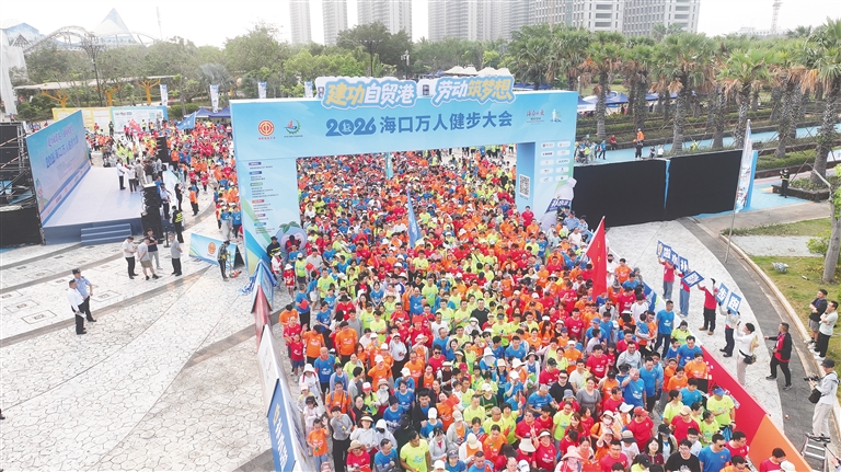 4月19日,以“建功自贸港·劳动筑梦想”为主题的2026海口万人健步大会在海南长影奇幻乐园举行。大国工匠、劳动模范、新就业形态职工代表、市民群众等约1.2万人齐聚一堂,用脚步丈量美景,在行走中激扬奋进力量。