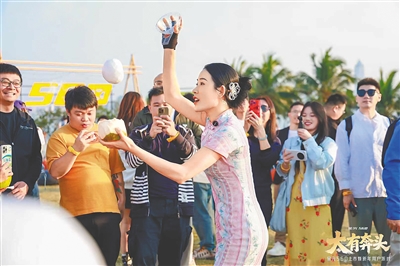 她把椰蛋先抛起来,再用塑料碗稳稳接住。从最开始只抛20多厘米,到逐渐加大力度,越抛越高,并不断丰富动作变化。她身着旗袍站在摊位前,一刀一削,动作行云流水,嘴里还时不时冒出几句吉祥话:“喝水吃肉,快乐长寿!椰圆人圆,事事圆满!”椰蛋在空中旋转、起落,围观的游客录视频、刷弹幕,全场欢呼沸腾。