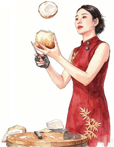 如今,吴雪依旧时常站在骑楼老街的椰子摊前,一刀一刀地削着椰子,一颗一颗地抛着椰蛋,在刀光椰影间,迎来送往一批又一批从远方奔赴而来的游客。在她手中,剖开的是莹润的椰子蛋,也是一段将生活历练酿为清甜的故事。