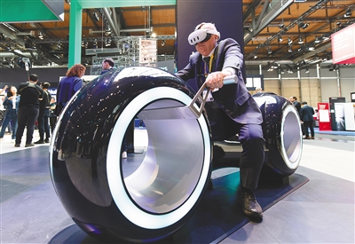图为4月20日,一名男子在德国汉诺威工业博览会西门子展区体验一款VR设备。