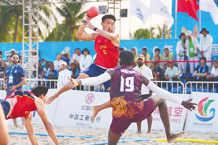 4月21日,第六届亚洲沙滩运动会在海南三亚开赛。当天下午,中国男子沙滩手球队迎战斯里兰卡男子沙滩手球队,最终以2∶0战胜对手。