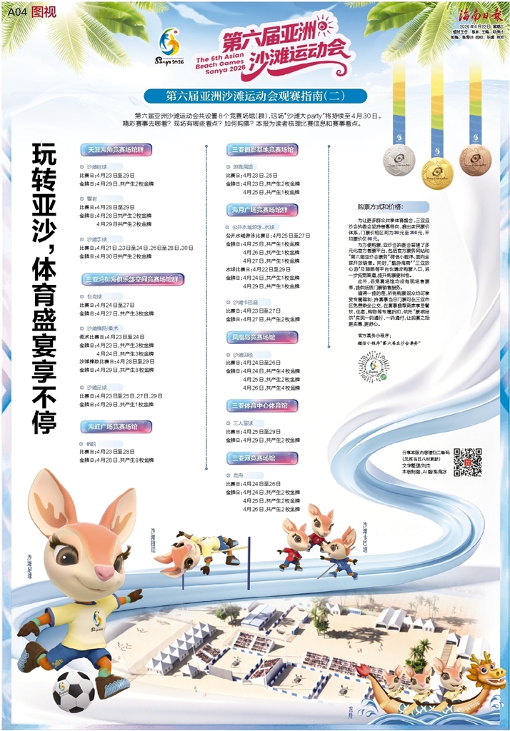 第六届亚洲沙滩运动会共设置8个竞赛场馆(群),这场“沙滩大party”将持续至4月30日。精彩赛事去哪看?现场有哪些看点?如何购票?本报为读者梳理比赛信息和赛事看点。