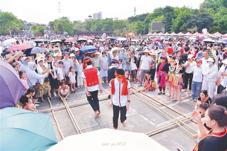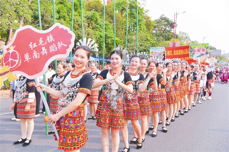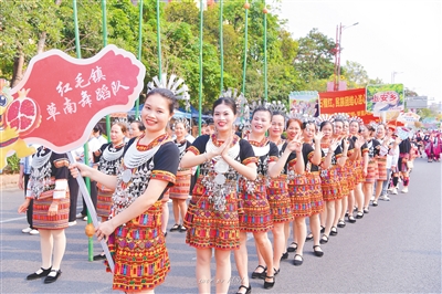 4月19日上午,“三月三”民族团结大巡游暨万人竹竿舞汇演将“三月三”的活动氛围推向最高潮。来自中平镇的黎族青年徐光泳跟随队伍穿行于县城主干道,难掩兴奋:“今年最期待的就是这个巡游活动,实在是太热闹了!”