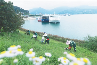 图为当日在三峡库区湖北省秭归县木鱼岛天问公园,环保志愿者在库区岸线上清理杂草垃圾。新华社发