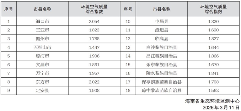 按照《环境空气质量标准》(GB3095-2012)及修改单、《环境空气质量评价技术规范(试行)》(HJ663-2013)和《城市环境空气质量排名技术规定》(环办监测〔2018〕19号)评价,2026年2月,全省环境空气质量优良天数比例为100%,其中优级天数比例为87.0%,良级天数比例为13.0%,无轻度及以上污染天。