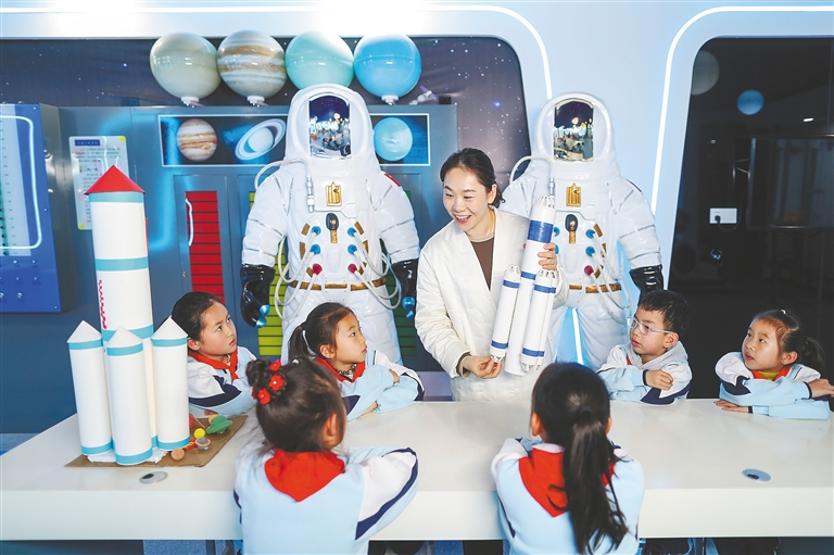 4月24日,小朋友们在河北省石家庄市长安区星穹天洲航天科技体验馆参加“我的航天梦”主题实践活动。