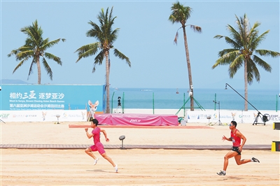 4月26日,在第六届亚洲沙滩运动会男子4×60米接力决赛中,中国队发挥出色,以26.06秒的成绩夺得金牌。图为中国队第三棒选手王新凯(左)奋力冲刺。