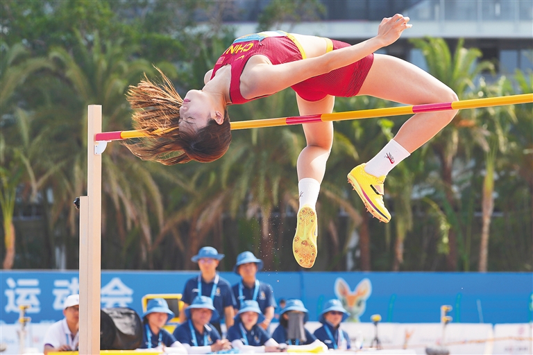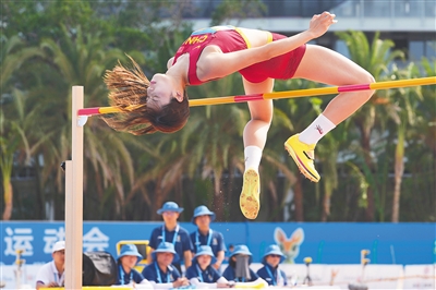 4月26日,第六届亚洲沙滩运动会沙滩田径女子跳高决赛在三亚凤凰岛举行。中国队选手胡麟鹏、邵雨琪同以1.83米并列收获银牌。图为邵雨琪在比赛中。