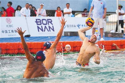 4月27日,中国队在三亚亚沙会男子水球单循环赛第三轮争夺中,以3∶0战胜中国香港队,取得三连胜。图为中国队持球进攻。4月28日,中国队与亚洲劲旅哈萨克斯坦队正面交锋。海报集团全媒体中心记者 王程龙 摄