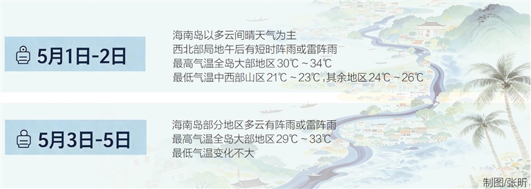 5月1日~2日,海南岛以多云间晴天气为主,西北部局地午后有短时阵雨或雷阵雨;最高气温全岛大部地区30℃~34℃,最低气温中西部山区21℃~23℃,其余地区24℃~26℃。
