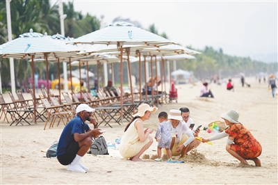 4月28日,三亚湾阳光和煦、椰风轻拂,许多游客前来享受滨海时光。